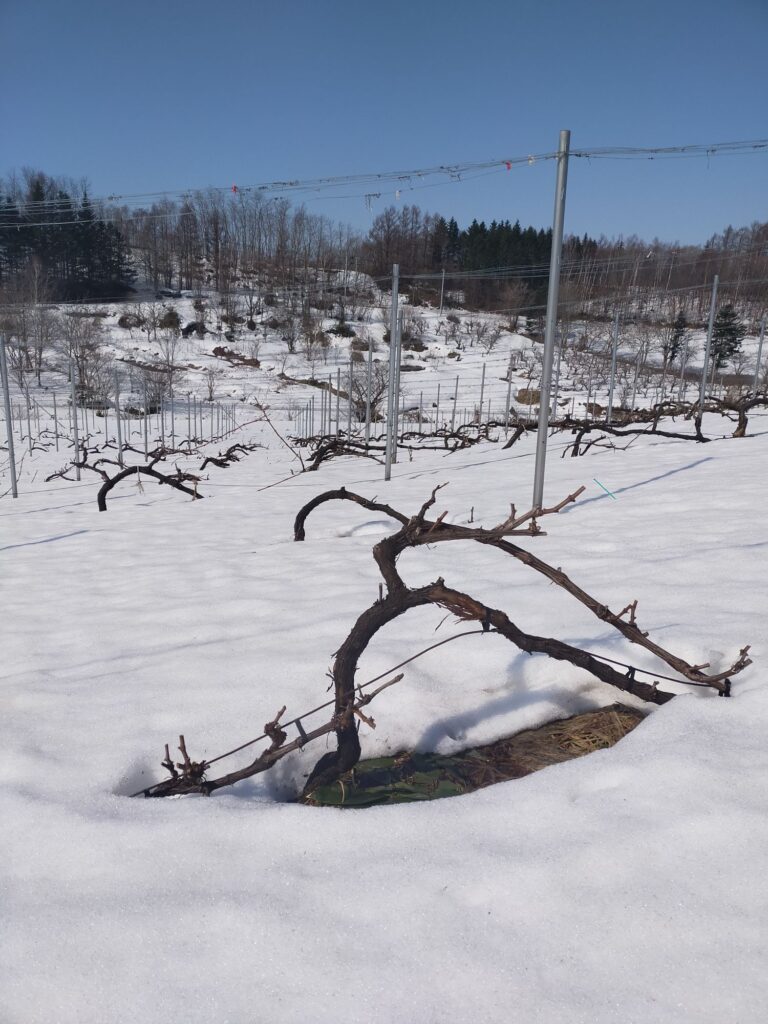 積雪は浅いところで10cmくらいでしょうか。近隣(登)の最も日当たりの良いエリアでは地面が見えてます。ちなみに数日前に10Rワイナリー(岩見沢)に行きましたが、畑には全く雪がなくブドウをフルーツワイヤーに固定する作業もほぼ終えているような状況でした。