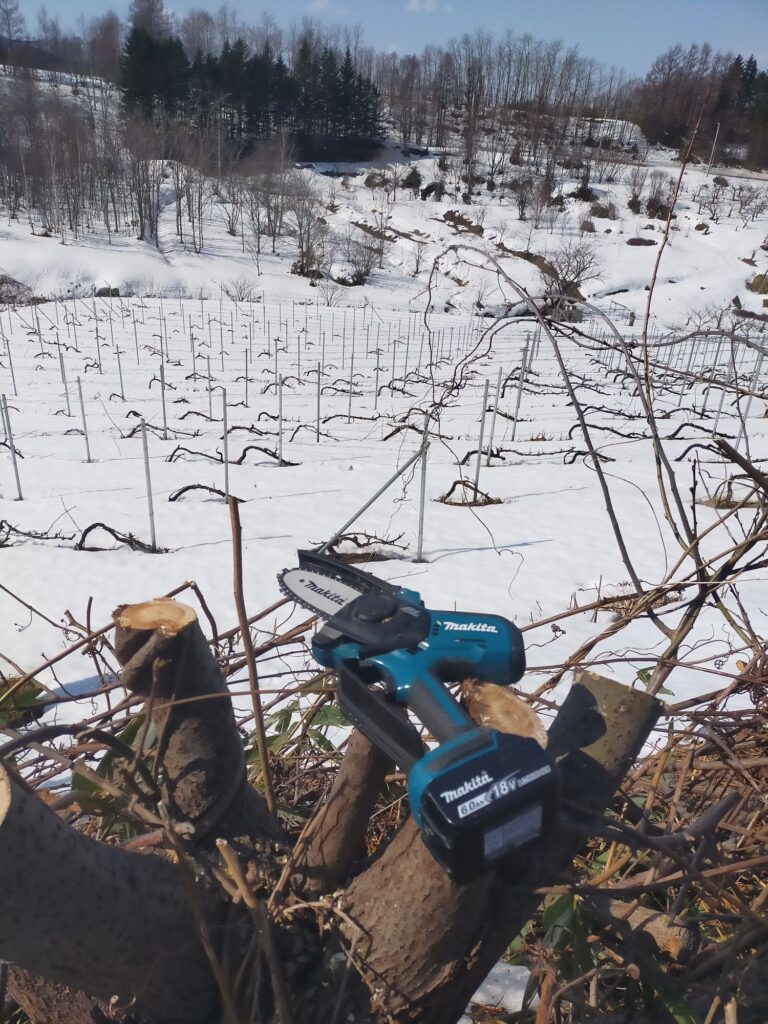 プルーンの剪定終わり、畑周縁の雑木伐採始めました。地味な作業ですが、放置すればそこが鳥の止まり木になり、食害が出やすくなります。景観的にもスッキリ。